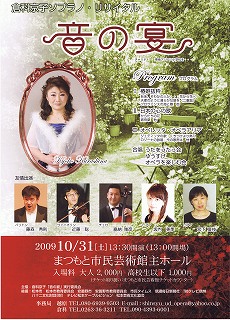 音の宴 2009年7月21日 by daruma 倉科京子ソプラノ・リサイタルが開かれます。 画像をクリックするとPDFでご覧になれます。 日時は、下記をご確認ください。 2009/10/31 (土) 13:30 開演 まつもと市民芸術館ホール 詳しくは、上記PDFで、ご確認ください。