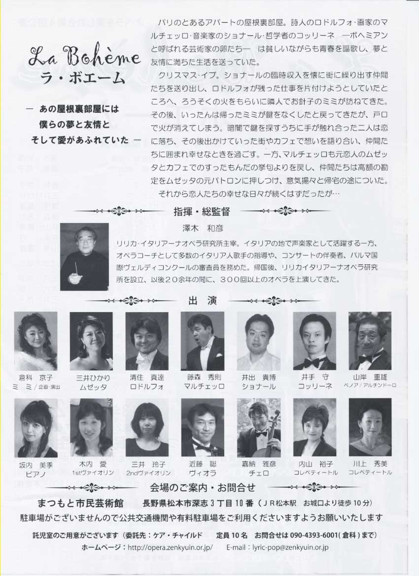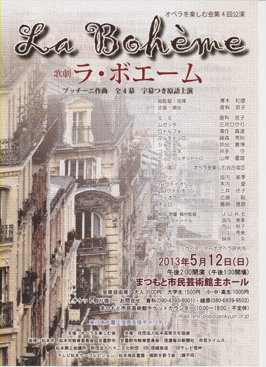 歌劇 ラ・ボエーム 2013年2月21日 by daruma オペラを楽しむ会 第4回公演 が5/12にまつもと市民芸術館主ホールにて、行われます。 演目 歌劇 ラ・ボエーム 当ブログの倉科京子さんが、ミミ役・企画・演出を担当いたします。 下記、パンフレットをクリックすると、ストーリー・出演者等のご確認ができます。